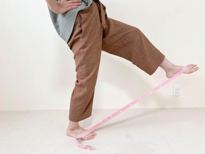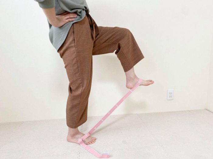 両足首にバンドを付けて、片方の足を浮かせて足を開いたり閉じたりする簡単なストレッチ。