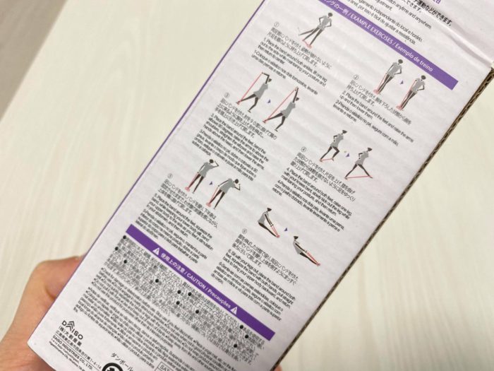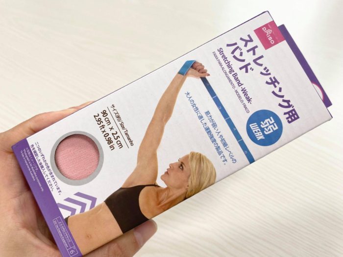 また、私が購入したのは、バンド自体の強度が「弱」のもので、<筋力が弱い人や初級レベルの大人の女性に適した運動強度の製品です。>と書かれていました!「強」のバンドも同じ場所に並んでいたので、「弱」じゃ物足りないかも…?パパと一緒に使おうかな?!という場合は「強」を選ばれた方が良いかもです。(ちなみに「強」のカラーは赤or青、価格は330円と「弱」よりお高いです!)