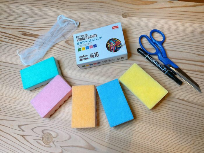 材料は<スポンジ・排水溝ネット・輪ゴム・マジック・(はさみ)>のみ。