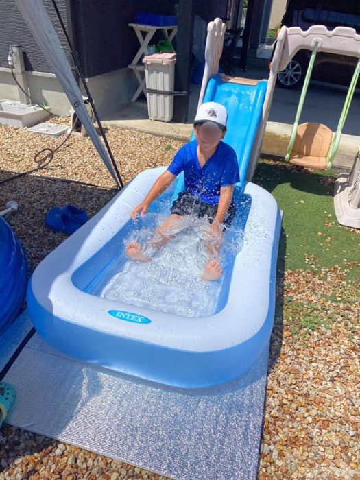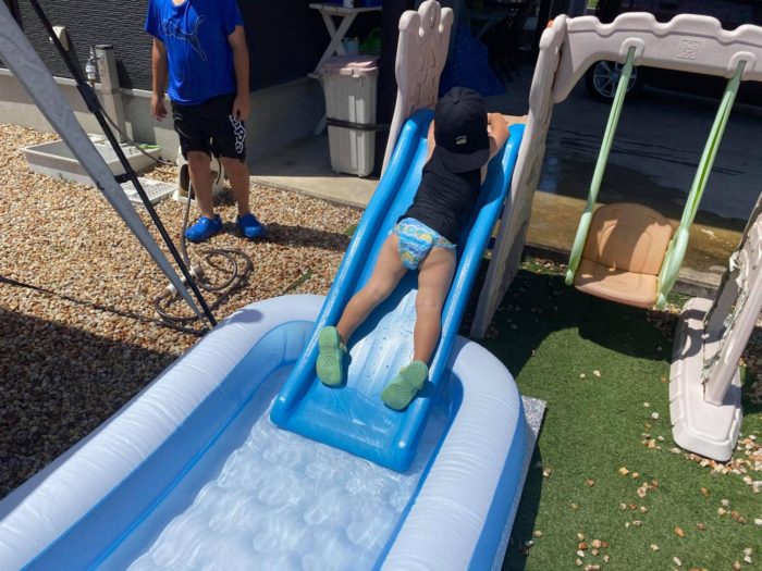 さらに、我が家の庭には、屋外用の滑り台があるのですが、プールを出すときは滑り台と合体して遊ぶのが定番になっています★