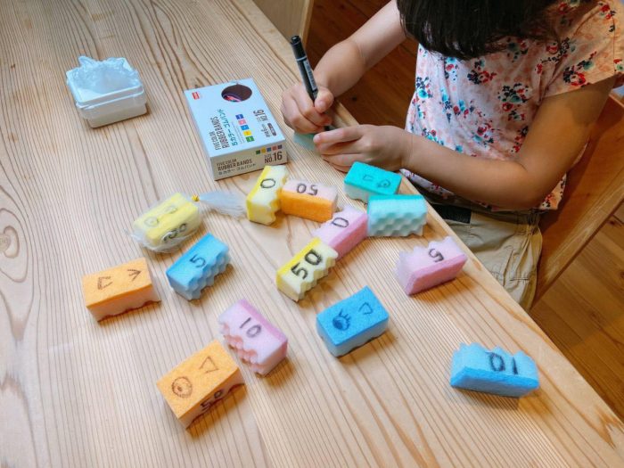 この時に、スポンジの裏や横部分に“点数”も書いておくと、遊ぶときに「何点取れたよ~♪」とか、親子や兄弟で点数で競ったりして遊べますよ★