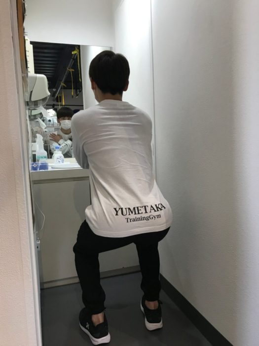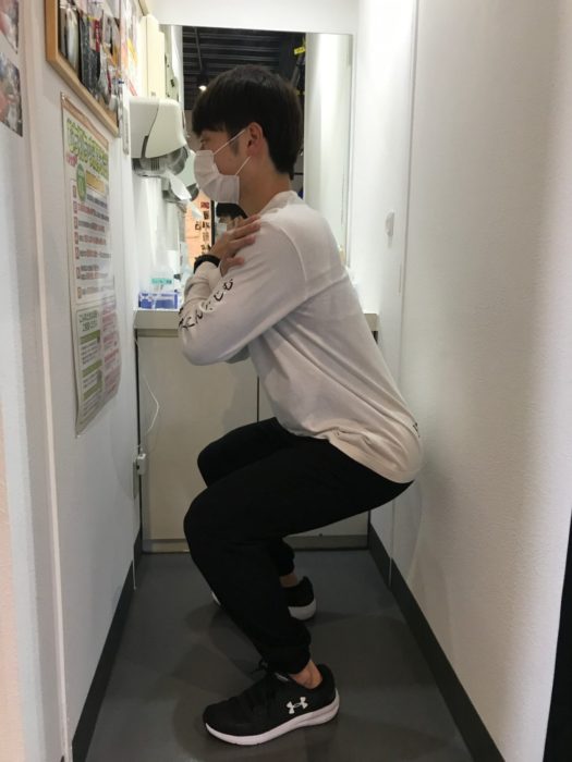 ↑横から見ると、このポーズが正解。はじめのうちは、まずお尻を後ろに突き出したことを確認してから、膝を曲げていくと良いそうです。