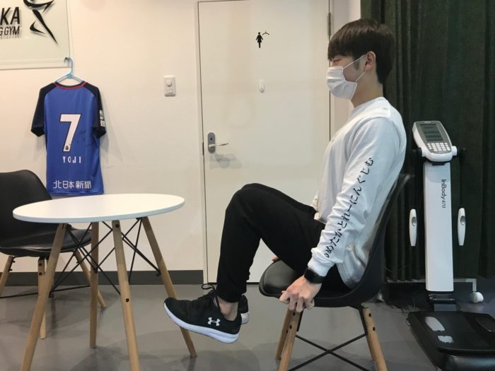 椅子に座ったらすかさず腹筋です。椅子のサイドを両手で持ち、膝の曲げ伸ばし!