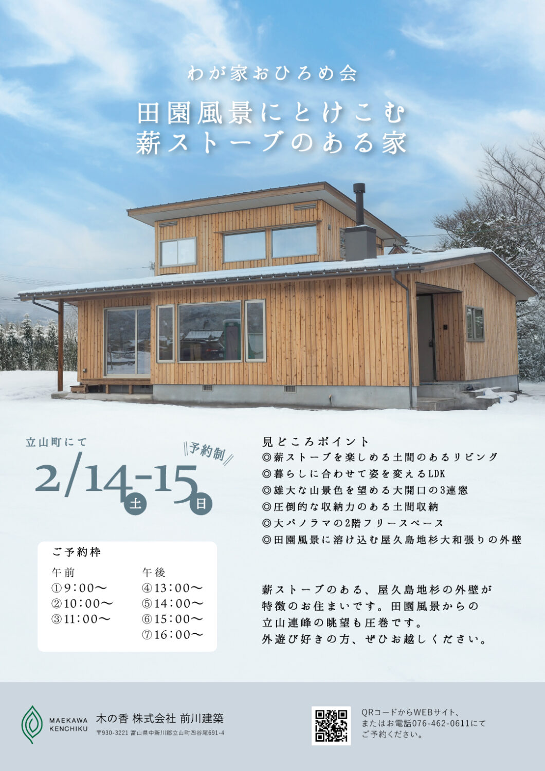 立山町にて、『田園風景にとけこむ薪ストーブのある家』の完成おひろめ会を開催します。