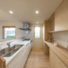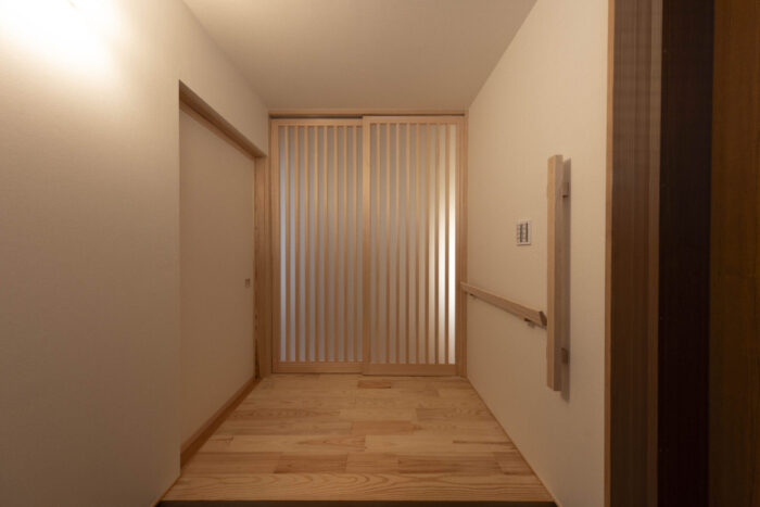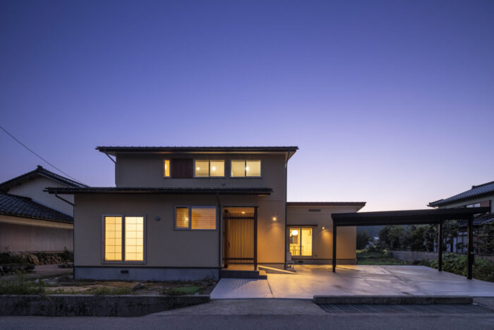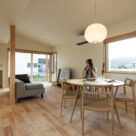 家族や世代それぞれの思いやりを大切に形にした住まいです。屋根の勾配を活かした天井が開放感を生み、大きな窓からは豊かな景色が広がります。手すりや玄関格子には肌触りの優しいスギを採用し、猫ちゃんや高齢のご家族も安心して過ごせるユニバーサルな配慮を徹底しました。広い敷地を活かした設計で、経年変化する素材の美しさを楽しみながら、家族の歴史を大切に紡いでいけるお住まいです。